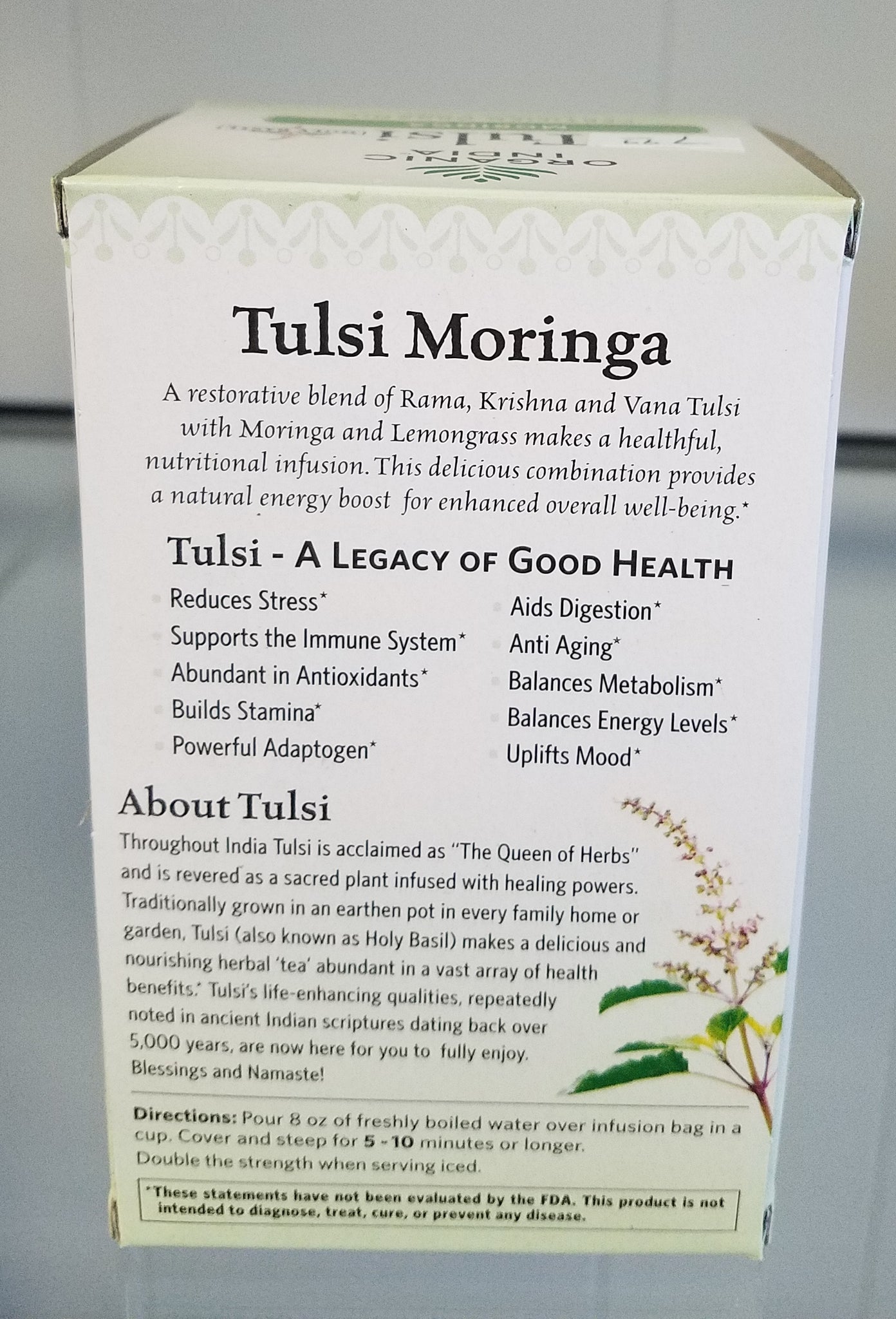 Ingredients: Organic Tulsi (Holy Basil) Blend, Krishna Tulsi (leaf), Rama Tulsi (leaf), Vana Tulsi (leaf), Organic Green Tea (leaf)